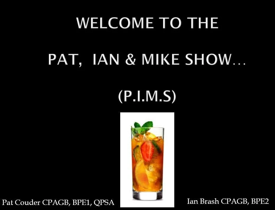 P.I.M.S. stands for the Pat, Ian and Mike entertaining show which develops during the talk. The presentation is something a bit different - a collection of images taken as part of monthly challenges on set themes, and only shot indoors. Their 'before and after' images will be shown and they will explain "how we did it", with member participation along the way.